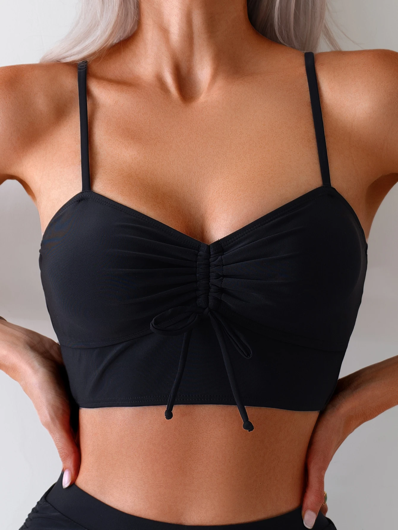 High End Women's Solid Black Spaghetti Strap Tankini Sexy 2-Piece Swimwear Set with Front Logo Woven Bra
